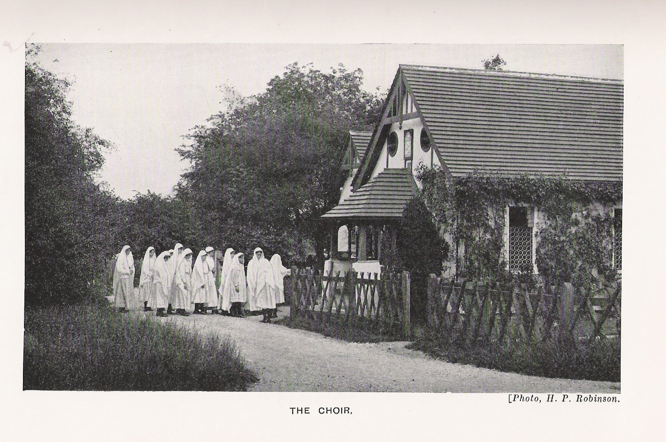 Lady Henry’s faith developed over the years. During her early temperance days, she worked along side Methodist women on the streets of Ledbury, the market town near one of her family homes, Eastnor Castle. But by the time she was in her fifties, she was a devout Anglo-Catholic and she filled not only her home at Duxhurst (The Cottage) but many of the buildings there with religious imagery. Although the village was non-denominational, Lady Henry was proud to assert “We are not afraid of ritual. Rightly understood it is a great help to faith.”